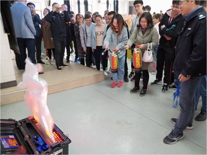 第二阶段是现场演练。保卫处工作人员利用仪器模拟了火灾,现场教大家如何正确使用灭火器。当火焰燃烧时,保卫处工作人员一手持喷管对准火源根部,一手迅速按压手柄,准确完成操作流程,火焰迅速被扑灭。师生们认真观看了整个流程,部分师生也亲自体验了使用灭火器灭火的过程,并正确掌握了操作方法。