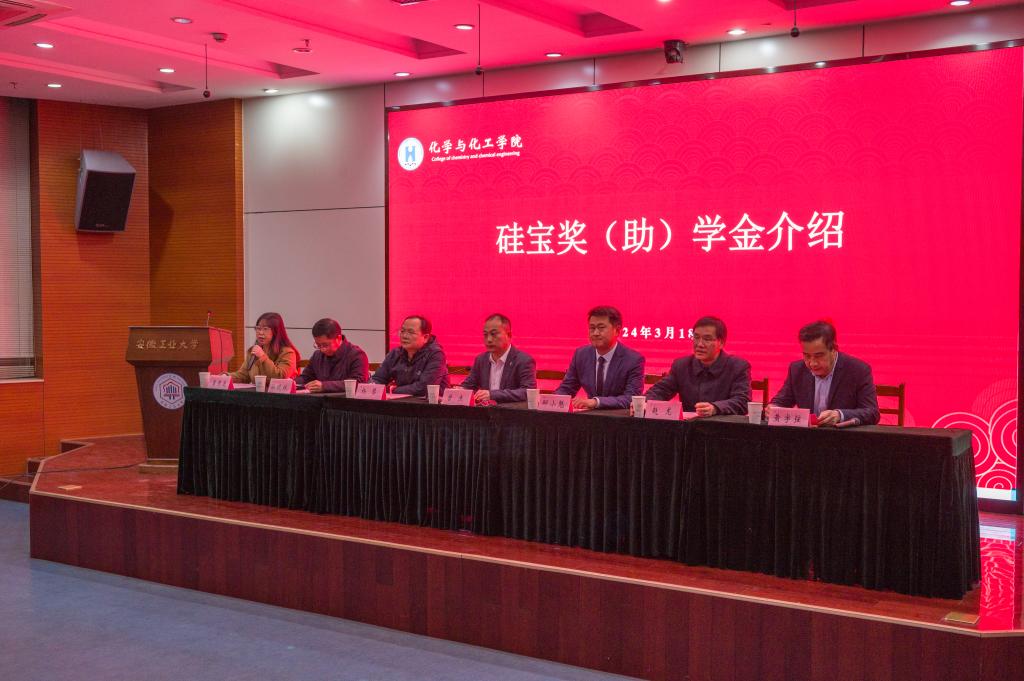 与会人员共同观看了硅宝有机硅新材料有限公司的宣传片。邱小魁代表安徽硅宝有机硅新材料有限公司对学校、学院长期关心支持企业发展表示感谢,并介绍了公司概况、装备技术及成年人动漫。希望进一步深化校企产学研合作,实现企业、学校、师生多方共赢,欢迎更多的安工大学子加入安徽硅宝,与企业共成长、同强大。应用化学201班叶晶晶、应用化学213班李春普同学分别作为硅宝奖学金及硅宝暑期社会实践优秀实践队长代表作了发言。