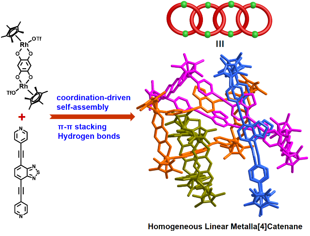 为此,本研究设计利用一种双齿苯并噻二唑衍生物连接配体与双核Cp*Rh基前驱体配位自组装,一步选择性合成得到由4个有机金属大环组成的同环线性[4]索烃化合物。X-射线单晶衍射结果证实:该配位超分子化合物是一种罕见的同环线性金属[4]索烃结构。4个互锁但不连接的有机金属大环形成了一个具有六个交叉点的不可分割的整体。其中,强的夹层型π-π堆叠相互作用和非经典氢键作用对金属[4]索烃结构的形成和稳定性起着至关重要的作用。
