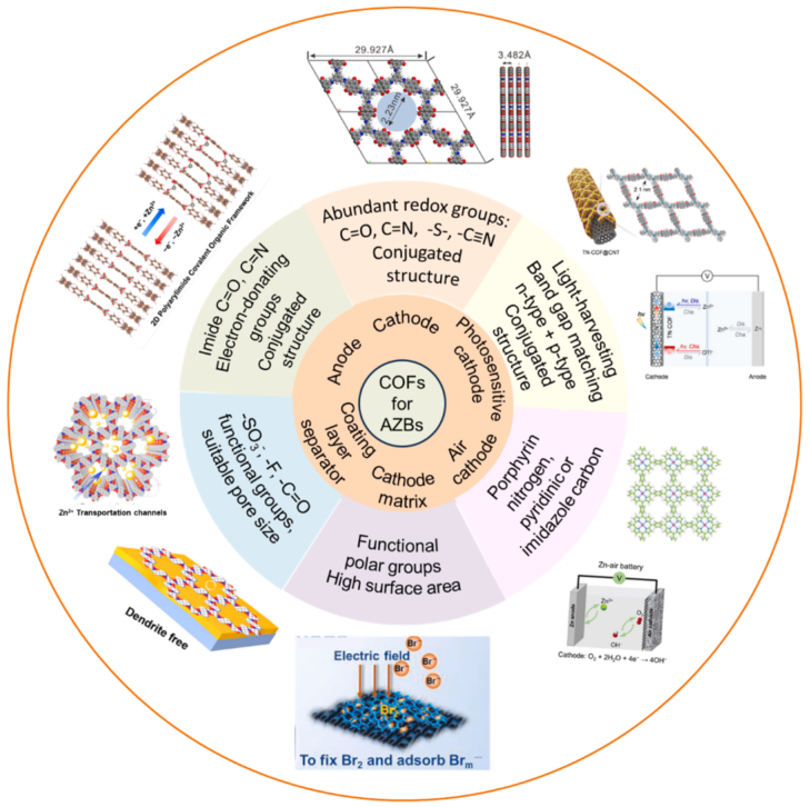 可充电水性锌电池(AZBs)已成为电网规模储能电池系统的理想选择之一。然而,其在实际应用中受到比能、循环稳定性和保质期等不理想因素的阻碍,通常是由于在充放电过程中正极材料的降解和锌负极的枝晶/腐蚀等原因造成的。在过去的几年里,共价有机框架(COFs)由于其可设计的分子结构、特殊的有序孔道和可调节的功能分子单元,已经被用于解决了水性锌电池中的固有问题。COFs由于有效储能组分的可行掺入和共价键结构的高稳定性,可以解决充放电过程中正极材料溶解的问题。通过建立基于COFs的界面层来均匀离子通量,提供更多的成核种子,抑制腐蚀反应,可以很好地延缓锌负极的枝晶和腐蚀问题。