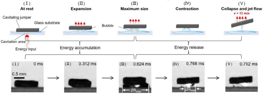 空化(Cavitation)通常指液体在低压或高温区域产生蒸汽泡的现象,气泡在溃灭瞬间可释放巨大能量,而传统上认为空化具有一定的破坏性,会对水力机械产生空蚀。本研究通过精确调控,利用光照可将空化效应转化为一种高效的动力来源,用于驱动微型执行器与机器人系统。在基于空化效应的高效、爆发式驱动机制下,我们成功展示了其在微型跳跃与游泳机器人以及多种仿生应用中的卓越性能。