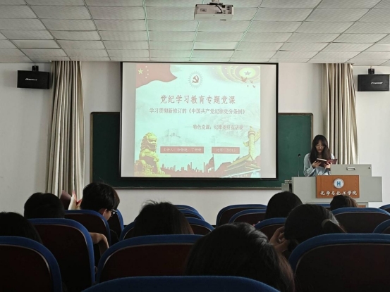 为深入学习贯彻习近平总书记关于党纪学习教育的重要讲话和重要指示精神,强化支部党员纪律意识和底线意识,提高责任担当。5月15日,成年人动漫 应化专业本科生第一党支部以《学习贯彻新修订的<中国共产党纪律处分条例>》为主题,组织开展“纪检委员有话说”特色党课,由支部纪检委员为全体学生党员讲授党纪学习教育专题党课。