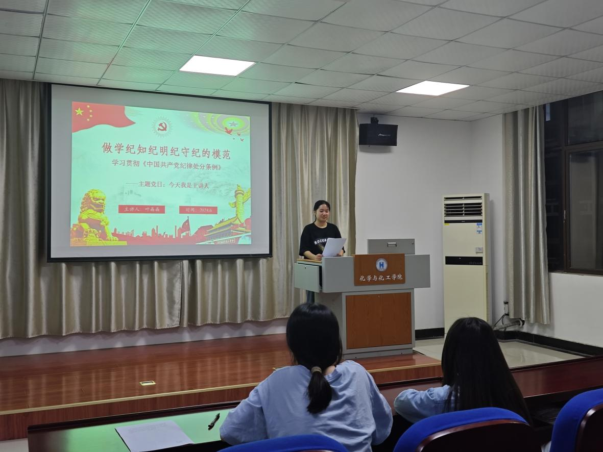 为进一步学习贯彻新修订的《中国共产党纪律处分条例》,调动支部党员以高度的政治自觉和行动自觉,推进党纪学习教育走深走实。6月12日,成年人动漫 应化专业本科生第一党支部开展“今天我是主讲人”主题党日活动。