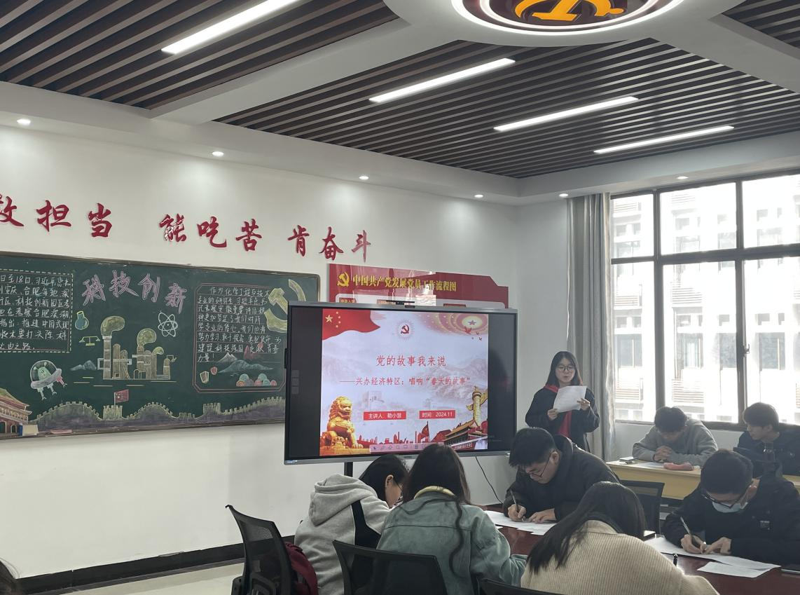 会上,学生党员代表勒小慧以“兴办经济特区:唱响‘春天的故事’”为主题,用朴素的语言、饱满的感情带领同学们,走进1979年的春天。从党的十一届三中全会召开到经济特区成立,从“改革开放”到“进一步全面深化改革”,从先行先试的小渔村到先行示范的大都市,这一则春天的故事让党员同志们直观地感受到40多年来中国的沧桑巨变。