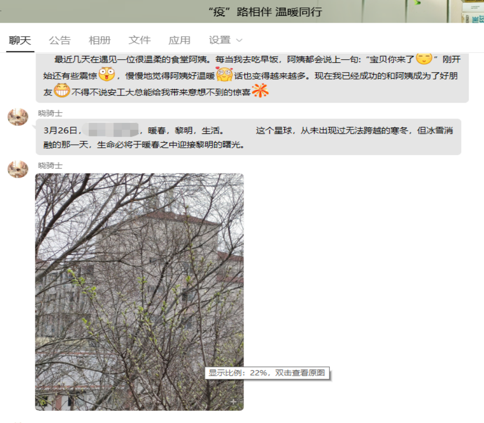 参与同学在活动群中通过文字、视频、照片等方式,分享近日生活中不经意的幸福瞬间,比如学校分发了防疫物资、食堂新增的菜品、教三的樱花开了、打卡了跑步公里……活动持续了为期五天时间,通过“疫情时光”里幸福、温暖、感人的故事分享,同学们更加关注自己的情绪体验,也在这个过程中得到了解压、放松、和娱乐。